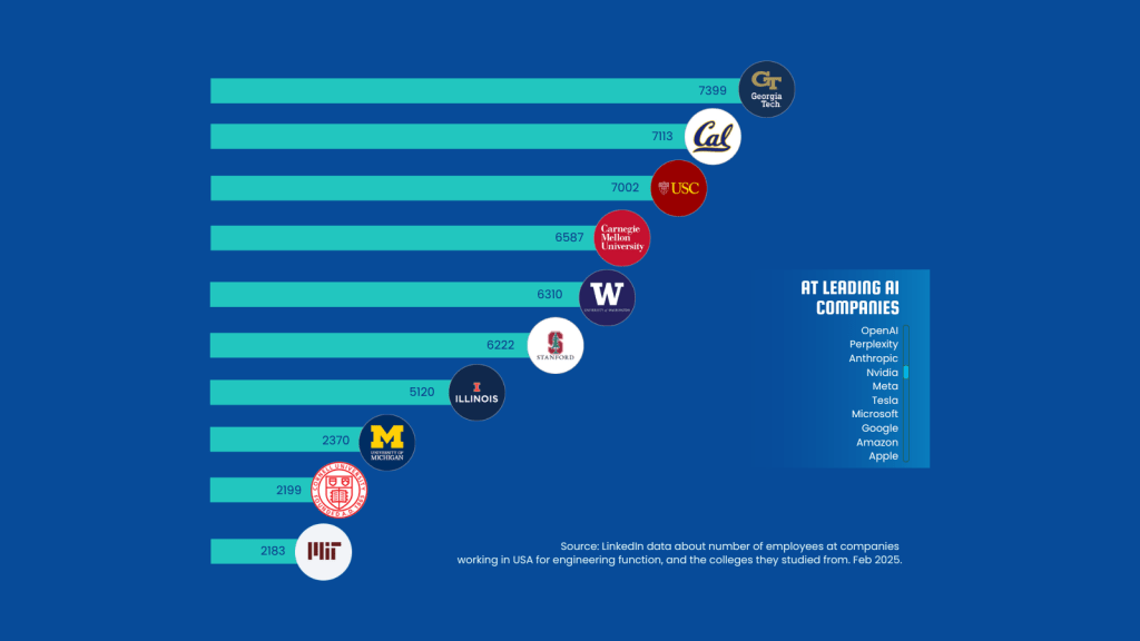In the competitive world of technology, certain universities consistently stand out as the breeding grounds for talent that fuels the industry’s top companies. We analyzed data from LinkedIn for firms like Meta, Nvidia, Coinbase, Tesla and SpaceX and this reveals clear trends about which schools dominate the hiring pipelines. Let’s explore the universities that have made their mark in connecting graduates to some of the most influential companies in the world.